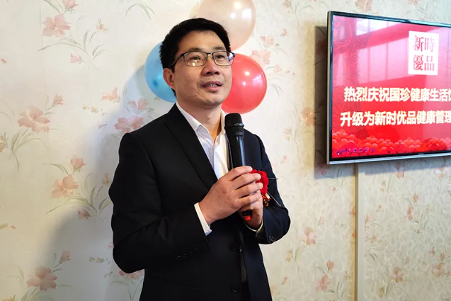 朱红涛总经理现场致贺词,介绍了新时优品健康管理服务中心升级的重要意义,号召大家开拓发展思路、领跑行业升级,在健康中国的大舞台上谱写辉煌新篇章。