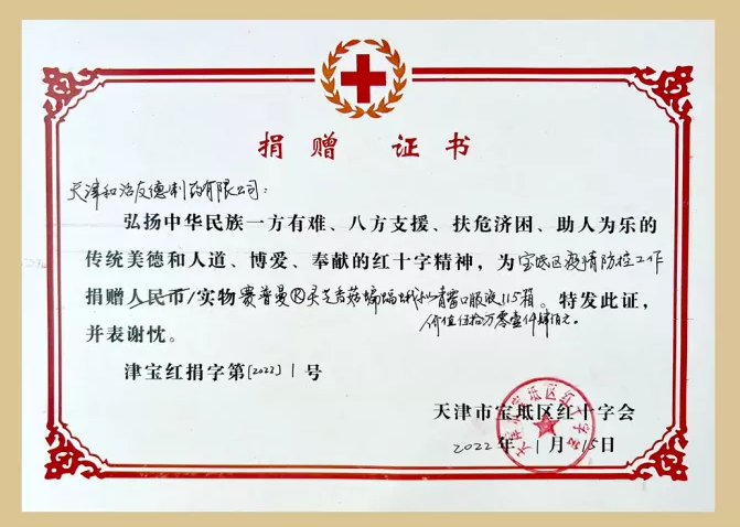 2022年1月17日,天津和治友德制药有限公司向天津市宝坻区红十字会捐赠价值50余万元的爱心抗疫物资,115箱和治友德“明星”健康产品——“赛普曼®灵芝香菇蝙蝠蛾拟青霉口服液”将陆续运抵宝坻区各个核酸检测点,送达抗疫一线工作人员和志愿者们手中。