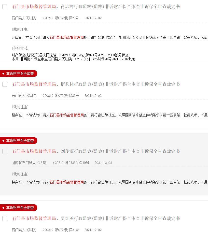 据中国裁判文书网信息显示,2021年12月2日,湖南省石门县人民法院连发五则与微团商城“涉嫌传销”相关的裁定书。裁定书显示,石门县市场监督管理局在查处广东微团商城电子商务有限公司、广东微团商城电商科技有限公司传销一案中,发现广东微团商城电子商务有限公司、广东微团商城电商科技有限公司及公司法定代表人个人银行账户来往密切,为防止转移或隐匿涉案的违法资金,石门县市场监督管理局于2021年12月1日向法院提出申请,要求对上述公司及个人在金融机构使用的相关银行账户及第三方支付平台账户上的存款予以冻结。