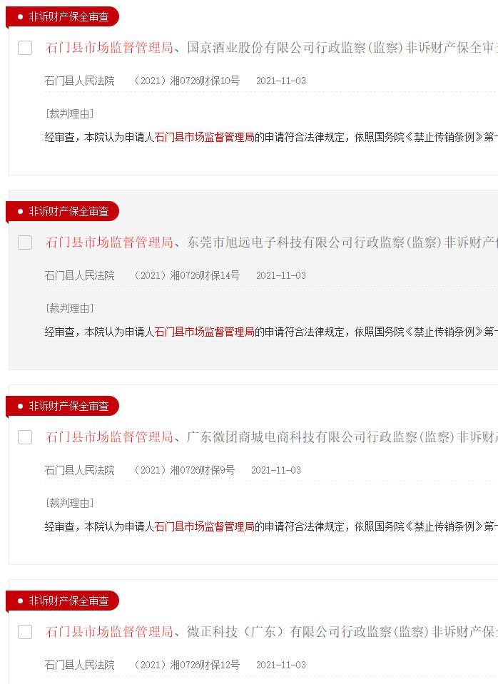 值得一提的是,2021年11月3日,湖南省石门县人民法院曾连续发布11份与微团商城“涉传”相关的财产保全执行裁定书,涉及公司包括微正科技(广东)有限公司、广东微团商城电商科技有限公司、广东微团商城电子商务有限公司、国京酒业股份有限公司、广东微团商城电商科技有限公司、东莞市旭远科技电子商务有限公司、恩脉恩生物科技(广东)有限公司等,涉及到的自然人包括赖晓云、赖小叶、赖吉荣、唐秀芳等,涉及冻结资金高达数亿元。