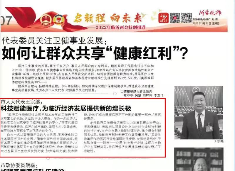 王宗继在《关于加速干细胞产业成果转化、实现我市精准医疗创新发展》的建议中指出,目前世界干细胞产业已处于爆发的前夜,临沂要赶在干细胞产业爆发之前,抢抓发展机遇,尽快推进我市干细胞产业高质量发展。