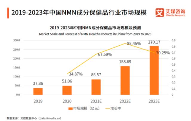 该报告表示,该分子每覆盖国内1%的营养品消费人口,将相应创造304亿的市场空间,千亿市场未来可期。从全球范围来看,华尔街券商美银美林认为全球抗老市场到2025年就可达6000亿美元规模。伴随全球人口普遍老化,前景将更为可观。据艾瑞咨询数据显示,截止2020年,国内“爱沐茵”类产品市场规模达到51.06亿,且仍旧以近70.25%的增速攀升,预计到明年,将扩张至270.13亿元。
