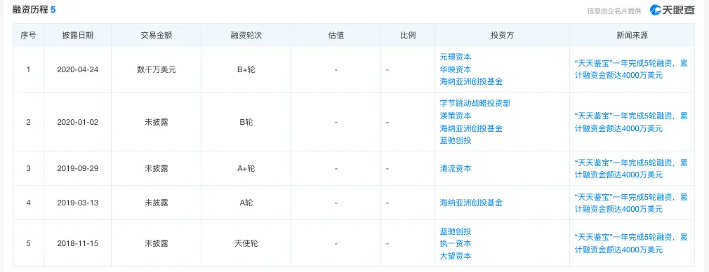 天眼查APP显示,2018-2021年,天天鉴宝共获得5轮融资,其中不乏知名投资机构。2018年11月,天天鉴宝获得了来自以太基金、执一资本、蓝驰创投的天使轮融资;2019年,获得了SIG独立投资的A1轮融资,清流资本领投的A2轮融资;2020年,又获得了渶策资本和字节跳动领投、SIG和蓝驰创投跟投的B轮融资。天天鉴宝累计融资金额达4000万美元,但红星资本局注意到,2020年4月后,天天鉴宝就不再有新的融资进入。