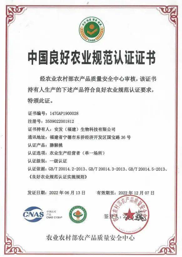 近日,安发生物拥有的安发古田生态科技园、安达石后两个基地种植的猕猴桃产品通过农业农村部农产品质量安全中心审核,喜获中国良好农业规范(Good Agricultural Practice,简称GAP)一级认证,拿到了通行全球的“护照”。