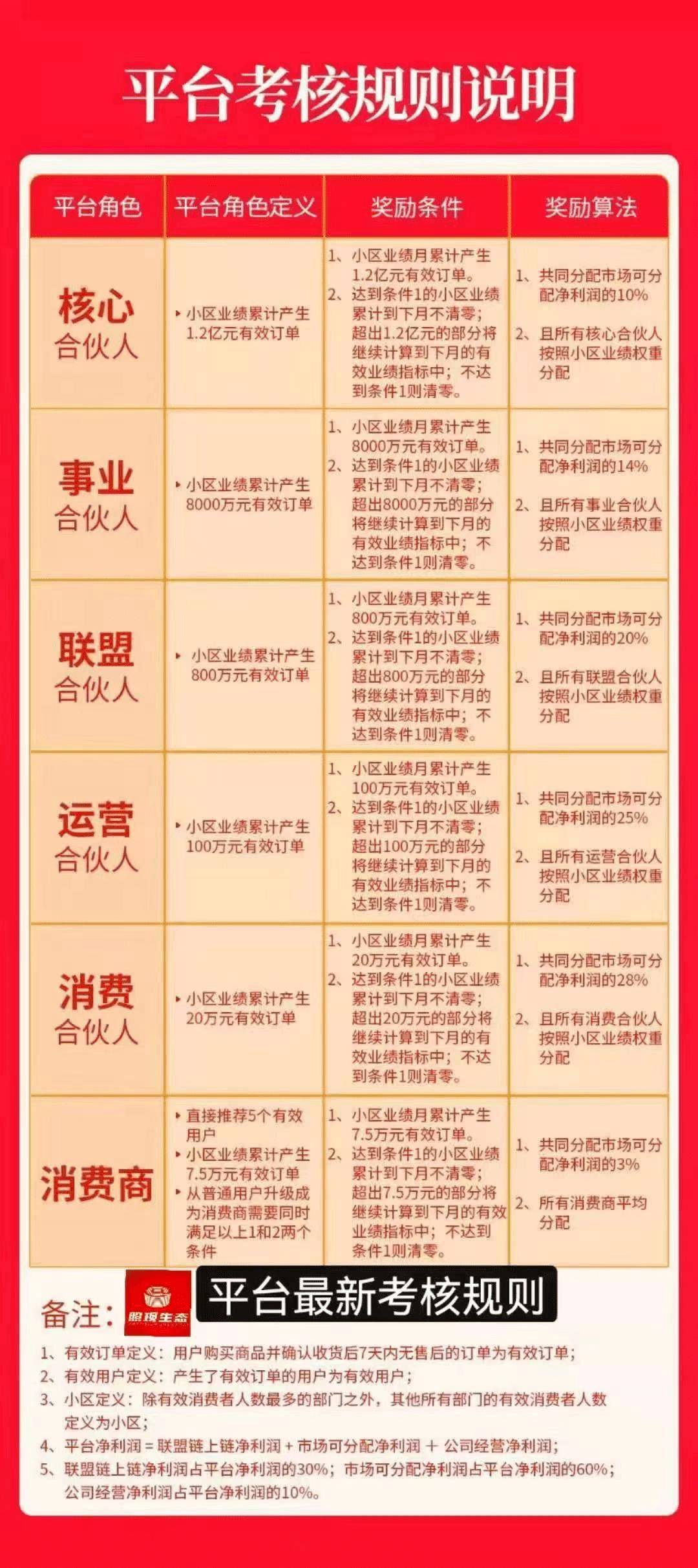 照现生态平台以“照现生态,消费创富”为口号,称在平台上消费即可变身为消费商,按照贡献提升等级,就可以赚钱。该平台模式拥有6个级别,分别是消费商、消费合伙人、运营合伙人、联盟合伙人、事业合伙人以及核心合伙人。小区业绩越高,收入也就越高,级别也随之获得升级。而对于照现生态平台后续动态,北青网健康也会持续予以关注。