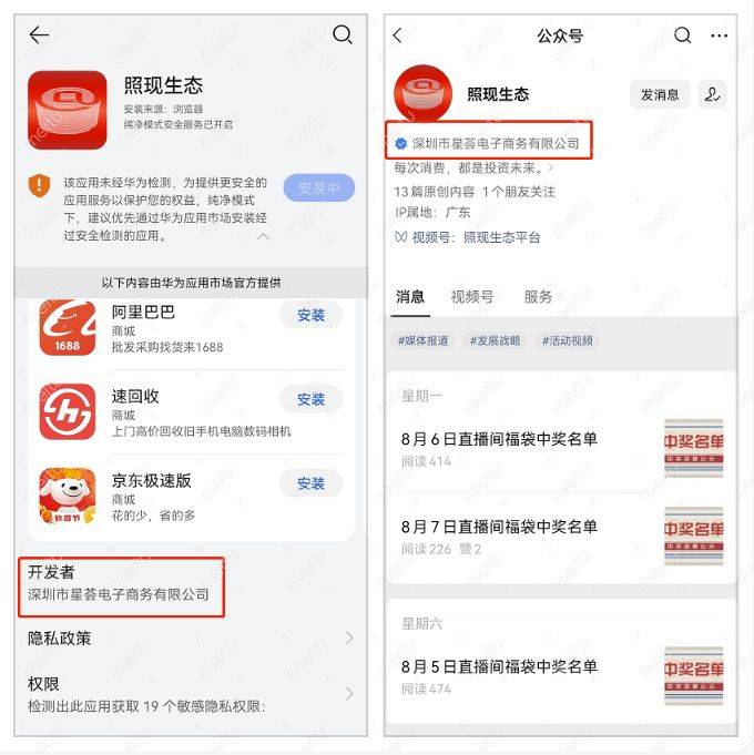 根据企查查提供的信息显示,星荟公司旗下的星链友店自2022年3月30日推出6.2.0版本以来,便已不再更新。北青网通过登陆星链友店APP后则被提示:根据公司整体运营规划,APP全新升级,特别推出新版APP“照现生态”,请所有会员移步至照现生态进行购物。根据照现生态APP及公众号,两者的认证主体均属于深圳市星荟电子商务有限公司。