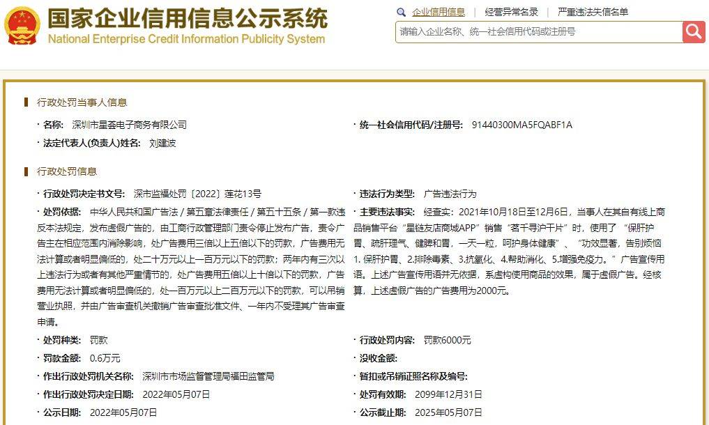 据国家企业信用信息公示系统显示,星荟公司曾在今年5月7日因发布虚假广告,被深圳市市场监督管理局福田监管局(简称:福田区市场监管)处罚。经福田区市场监管查实:2021年10月18日至12月6日,当事人在其自有线上商品销售平台“星链友店商城APP”销售“茗千寻沪干片”时,使用了 “保肝护胃、疏肝理气、健脾和胃,一天一粒,呵护身体健康”、“功效显著,告别烦恼1. 保肝护胃、2.排除毒素、3.抗氧化、4.帮助消化、5.增强免疫力。”广告宣传用语。福田区市场监管认为上述广告宣传用语并无依据,系虚构使用商品的效果,属于虚假广告。最终对星荟公司处以6000元罚款。