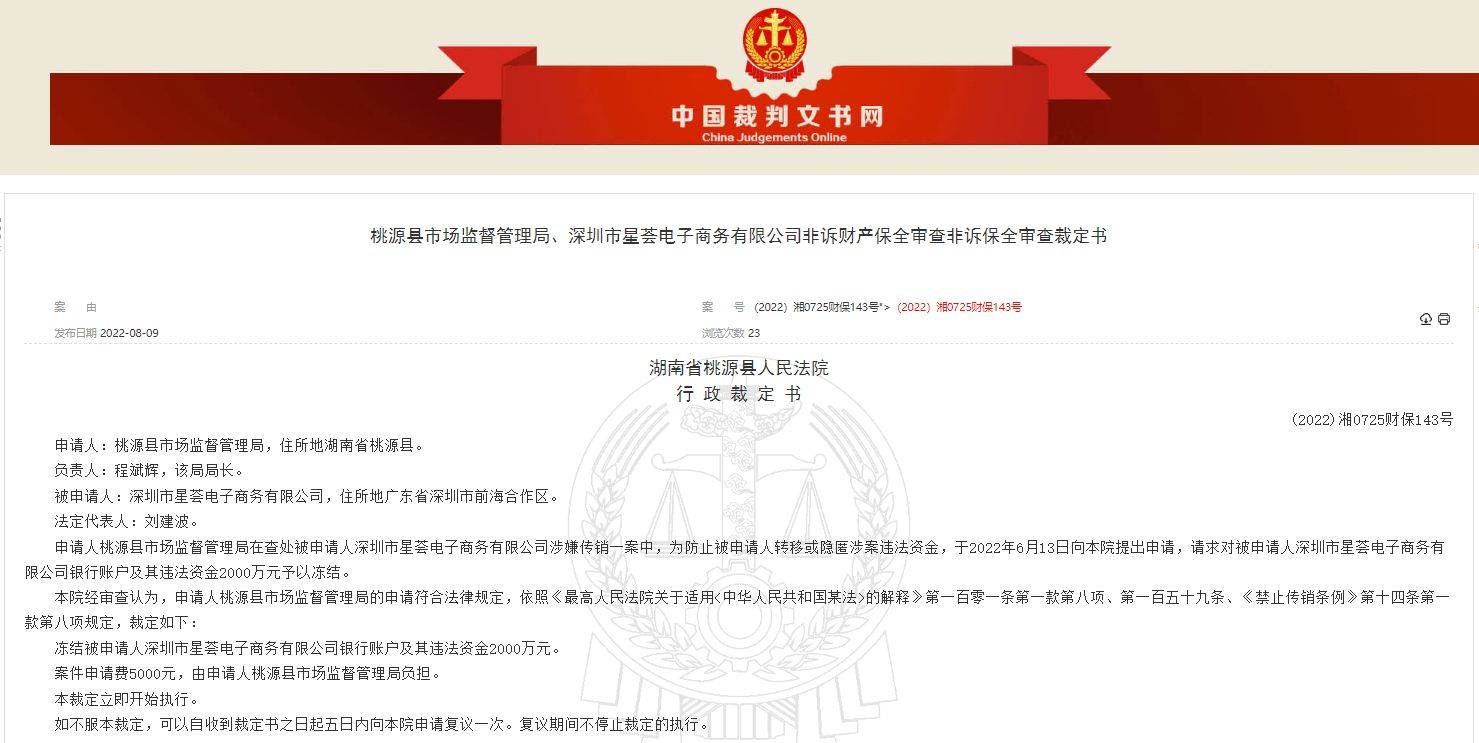 据该《审查裁定书》显示,申请人桃源县市场监督管理局在查处被申请人深圳市星荟电子商务有限公司涉嫌传销一案中,为防止星荟公司转移或隐匿涉案违法资金,于2022年6月13日向桃源县人民法院提出申请,请求对深圳星荟电子商务有限公司银行账户及其违法资金2000万元予以冻结。