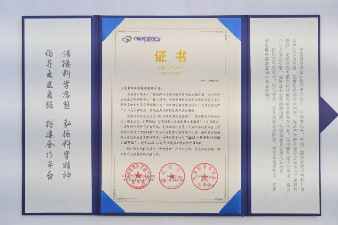 双迪公司获“2022中医药科技创新示范单位”荣誉