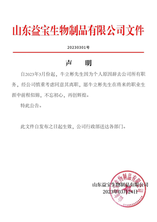 2023年3月24日,山东益宝生物制品有限公司发布声明称,牛立彬先生自2023年3月起,因个人原因辞去公司所有职务。