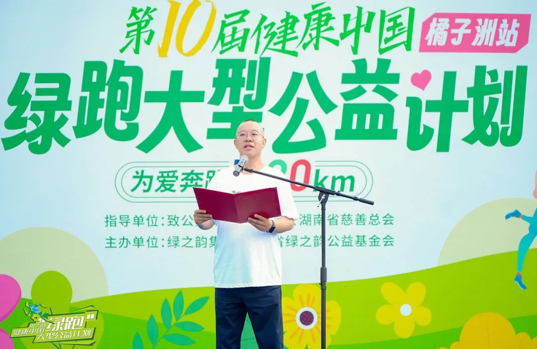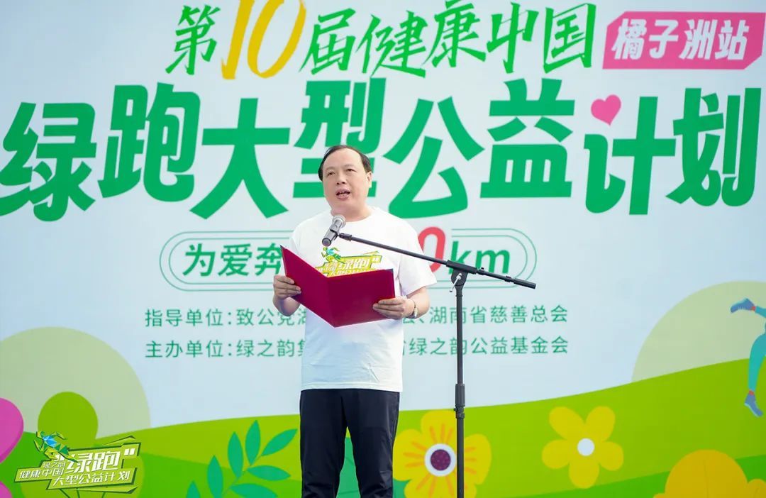 湖南省民政厅党组成员、副厅长廖国核致辞。他表示,今天,我们相聚在橘子洲,参与第10届绿之韵“健康中国-绿跑大型公益活动,共同见证湖南省绿之韵公益基金会成立10周年。他代表湖南省民政厅、湖南省慈善总会,向每一位心怀赤诚的参赛选手致以问候,向深耕公益的绿之韵集团表示诚挚感谢,向所有为湖湘慈善事业添砖加瓦的仁人志士致以崇高的敬意。公益是精神图腾,慈善是心灵长跑。他表示,10年来,绿跑从松雅湖到湘江,从企业善意到30万群众参与,每一步都刷新公益温度,丈量文明高度。绿之韵集团22年坚持将公益融入企业血脉,在扶危济困等领域播撒希望。绿跑活动10年捐赠款物近3000万元,吸引3万人参与,辐射超30万人次。湖南省绿之韵公益基金会10年来组织了400多场公益活动,捐赠款物9100多万,彰显了企业担当,诠释了湖湘精神。