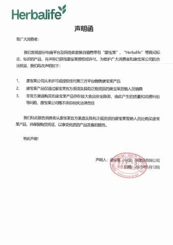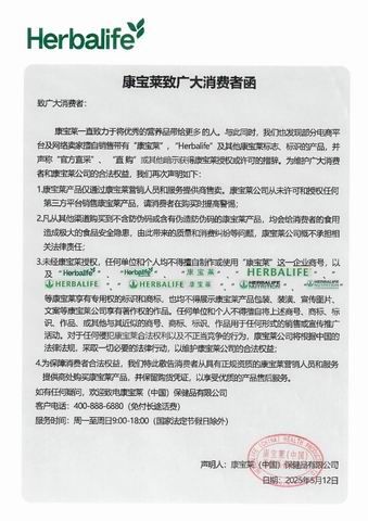 特此提醒广大消费者:康宝莱从未授权任何第三方电商平台(淘宝、天猫、京东、拼多多等)销售产品!购买康宝莱产品请认准官方渠道:康宝莱官方商城、莱聚APP、康宝莱营销人员。非官方渠道购买的产品存在极大食品安全隐患,为保障您的权益,请务必仔细阅读以下声明函和致消费者函,并广而告之。