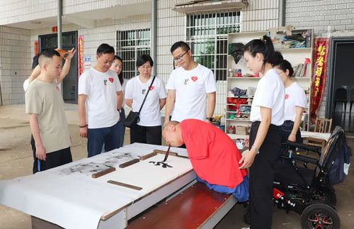 活动当天,绿之韵幸福国际爱心志愿者一行还前往四肢残缺的画家周国民及农村残疾青年家庭进行走访慰问,送去暖心物资及爱心慰问金。四肢残缺的画家周国民在夏总及爱心志愿者的帮助下挥毫泼墨,写下了《初心》《绿之韵幸福国际》的书法作品。我们相信,命运夺走了他的部分躯体,爱让他的人生不再残缺。