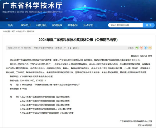 近日,广东省科技厅公示了2024年度广东省科学技术奖获奖名单。其中,由暨南大学主导、完美(广东)日用品有限公司参与的项目《常用中药药效物质研究关键技术体系构建与推广应用》荣获“2024年度广东省科学技术奖科技进步奖一等奖”。