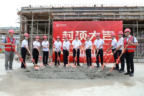封顶仪式现场,俄罗斯工程院外籍院士、安发国际控股集团董事局主席高益槐教授,福建省特殊食品与化妆品协会会长、安发国际控股集团总裁高炜带领安发生物董事黎锦祥,副总裁唐文波、庞正昊、蓝海云、陈然,总裁助理高丽、郑春源、林素玲,和项目施工方代表共同挥锹完成最后一方混凝土浇筑。安发生物各部门负责人共同见证了这一重要时刻。封顶活动得到了国家、省、市、区等多家主流媒体的高度关注并进行跟进报道。