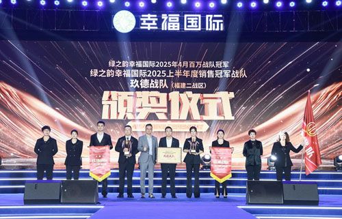 绿之韵幸福国际的荣耀殿堂里,百万战队的旌旗迎风招展,熠熠生辉。那些在市场一线冲锋陷阵的战队,如同璀璨的星辰,闪耀着夺目的光芒。他们以无畏的勇气和坚韧的毅力,带领团队取得了一个又一个辉煌的成绩。绿之韵集团市场运营中心市场业务总监谭红、市场运营中心市场业务总监喻鸣鸾为“绿之韵幸福国际4-5月单月达成百万战队”颁发荣誉。绿韵悦喜智能科技有限公司总经理杨邢轩,绿之韵幸福国际市场商学院特聘教授、绿韵悦喜智能科技有限公司首席研发专家骆春岗共同为“绿之韵幸福国际4-5月双月达成百万战队”颁发荣誉。绿之韵幸福国际市场商学院院长、绿之韵健康专家委员会专家委员侯俊霞为绿之韵幸福国际“2025年5月百万战队冠军”玖乐战队颁发荣誉;绿之韵国际商学院执行院长黎芋成、绿之韵集团运营部执行总经理·国际商学院常务副院长陈敏、绿之韵集团品宣部执行总经理龙雅凤依次为绿之韵幸福国际“2025年上半年度销售冠亚季军战队”玖德战队、玖翔战队、鹏海战队颁发荣誉。战旗所向,所向披靡,这正是绿之韵幸福国际“战区化管理”最生动的演绎。