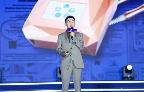 绿韵悦喜智能科技有限公司总经理杨邢轩,绿之韵幸福国际市场商学院特聘教授、绿韵悦喜智能科技有限公司首席研发专家骆春岗为“绿之韵幸福国际4-5月双月达成百万战队”颁奖