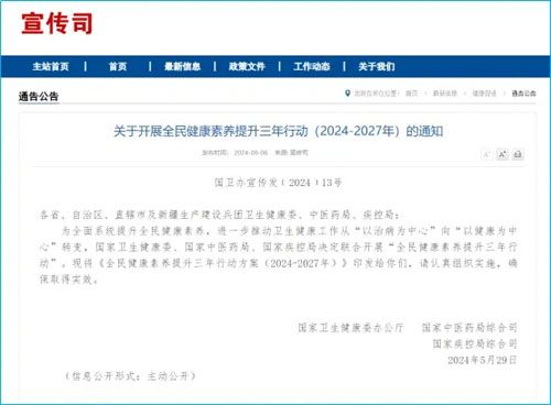 为全面系统提升全民健康素养,进一步推动卫生健康工作从“以治病为中心”向“以健康为中心”转变,国家卫生健康委、国家中医药局、国家疾控局决定自2024年开始,联合开展“全民健康素养提升三年行动”。