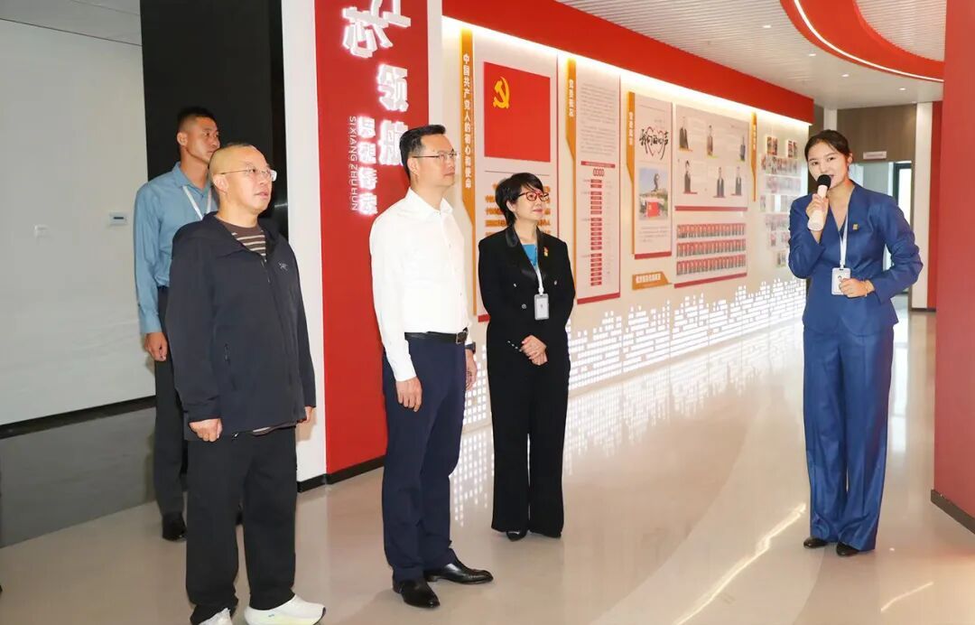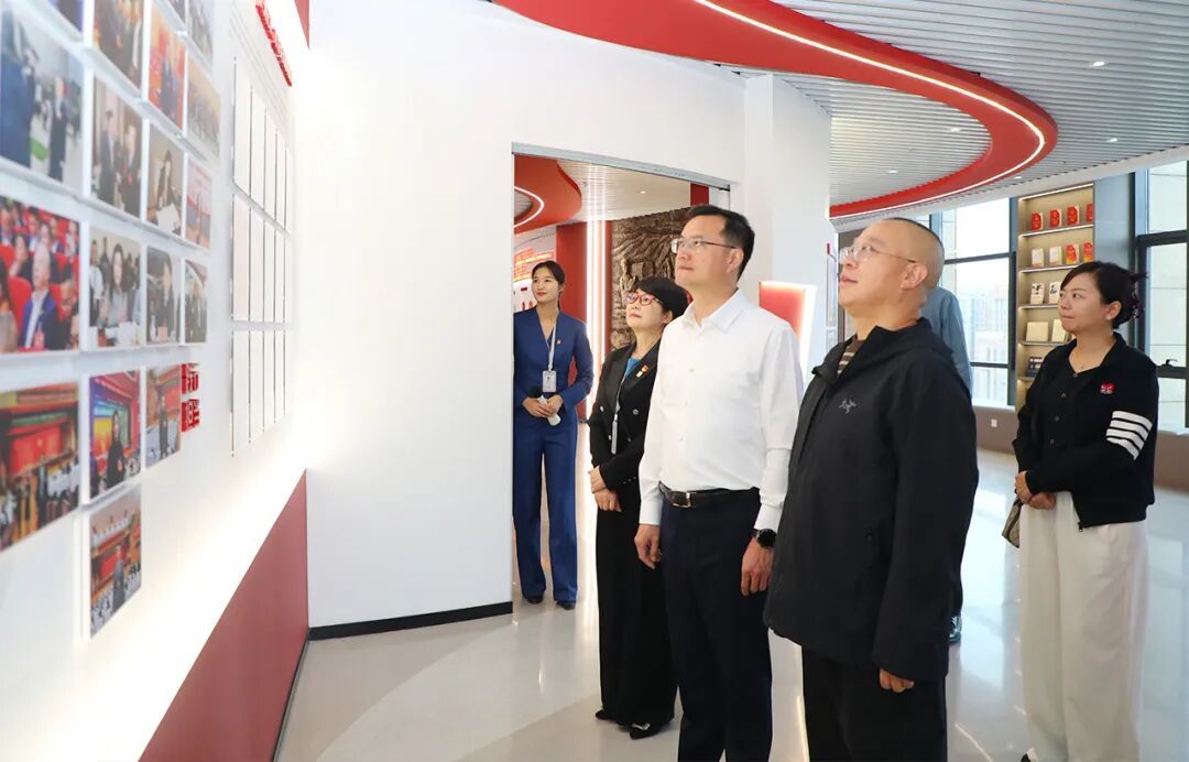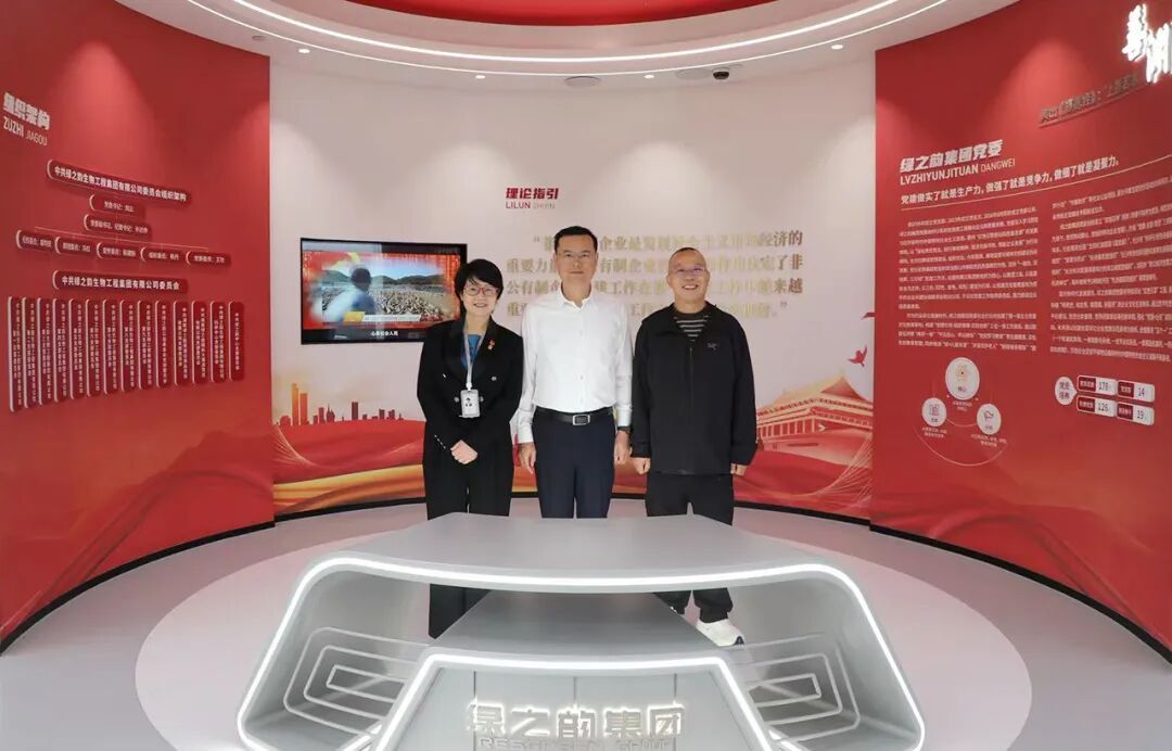 调研组一行首先来到绿之韵中心数智化科技展厅参观。展厅设计深度融入企业“水之道”理念,以水的旅程为叙事主线,将企业初心与情怀贯穿始终,同时融合“东哲西技”概念,展现独特的文化底蕴。展厅运用数字技术打造互动体验,构建智慧型新时代中医药文化展示空间,通过立体空间多维度呈现集团企业文化、发展历程、党建公益、产品理念、科研实力及未来愿景等内容。在绿之韵中心党建教育阵地,刘云书记就企业非公党建情况作了详细介绍。自2006年成立党支部,2013年获批成立党总支,2016年8月获批成立党委以来,绿之韵坚持构建以集团党组织为核心,以集团工会、公益基金会为主体,注重红色基因塑造的新时代非公党建新生态,推进“三色、三有、三亮”建设,坚持“一融合、双培养、三引领、四坚持、五到位、六强化”党建工作法,实施“指导式”“责任式”“温情式”管理,形成了具有绿之韵特色的非公党建工作品牌。