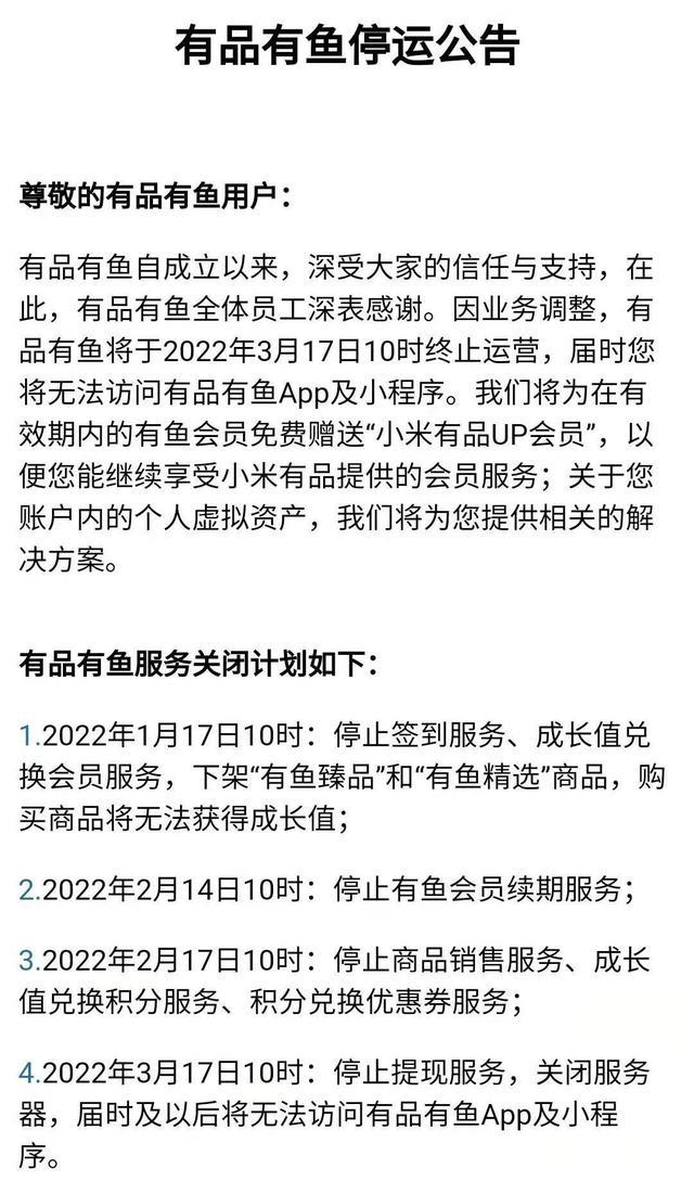 1月17日,大河报·豫视频记者从小米旗下新国货会员制电商平台有品有鱼获悉,因为公司业务调整,2022年3月17日10时,有品有鱼将终止运营。