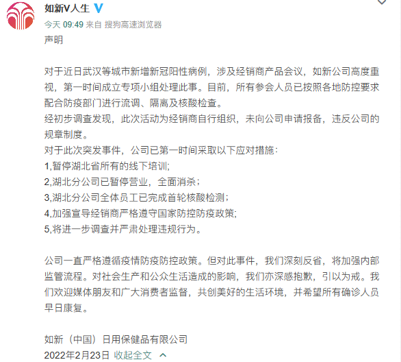 2月23日,如新就近日“武汉等城市新增新冠阳性病例,涉及经销商产品会议”一事发布声明,声明具体内容如下: