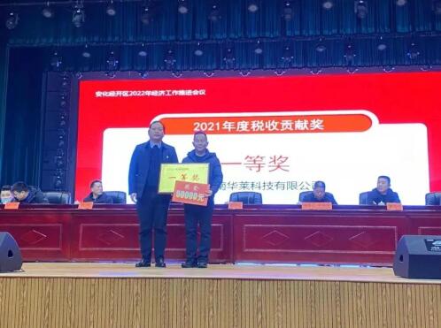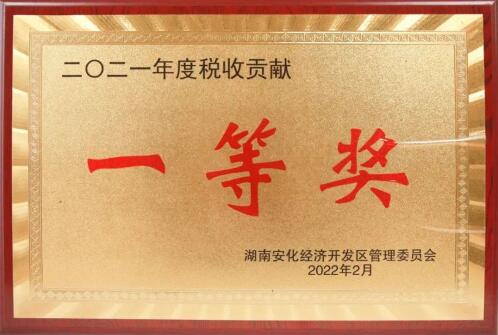 2月22日,安化经开区2022年经济工作推进会议在安化大剧院召开,会上回顾总结了2021年度区域经济工作情况,明确了2022年目标任务,宣读了《关于表彰2021年度全区高质量发展获奖企业的通报》,并为2021年度优秀企业颁奖。公司副总经理曾卫军代表公司参会,领取“2021年度税收贡献一等奖”、“2021年度产值贡献一等奖”奖项。