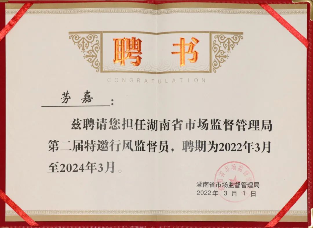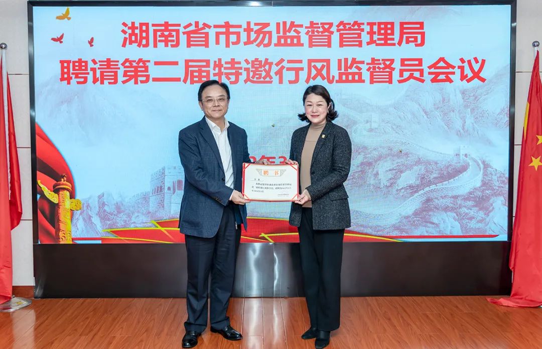 湖南省市场监督管理局党组成员、省药监局党组书记梁毅恒宣读了《关于省局干部队伍作风纪律教育整顿总体情况的通报》。湖南省市场监督管理局副局长李沐宣读聘请特邀行风监督员的通知。劳嘉总裁受聘为湖南省市场监督管理局第二届特邀行风监督员。此次被续聘为省市场监督管理局第二届特邀行风监督员,劳嘉总裁深感责任重大。她表示,将继续大胆认真、依法依规履行市场监管系统行风建设监督职责,发挥好参谋咨询作用、桥梁纽带作用、建言献策作用、舆论引导作用,为我省市场监管工作和队伍建设作出积极贡献。