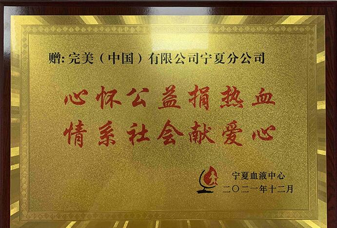 秉承“取之社会,用之社会”的公益理念,完美宁夏分公司积极组织建立了一支宁夏完美人爱心应急献血队伍,哪里有献血助人,哪里就有宁夏完美人的身影。因为有你们,社会才有了温暖,因为有你们,生命才有了温度! 2016年,完美宁夏分公司获颁“全国无偿献血促进奖单位奖”荣誉牌匾;2017年,自治区卫计委授予分公司“爱心应急献血集体”荣誉牌匾。