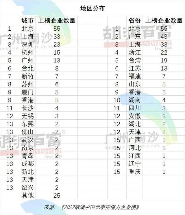 总部位于北京、上海、深圳的企业占一半;北京的企业最多,有55家;其次是上海,33家;深圳第三,23家;杭州第四,15家;广州第五,13家,其中南沙有3家。粤港澳大湾区占全国22%,长三角地区占全国31%。