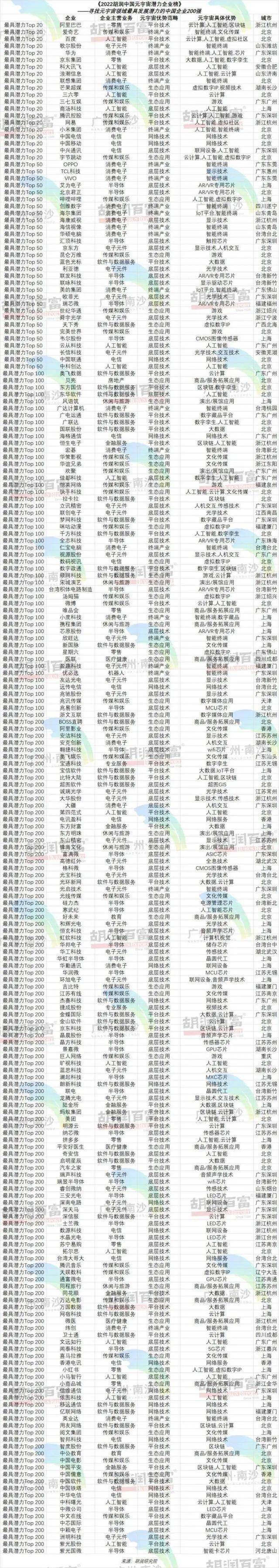 中国移动、中国电信、腾讯控股、阿里巴巴、百度、网易、华为、歌尔股份、小米集团、中兴通讯、京东集团、字节跳动、科大讯飞、商汤科技、浪潮信息、联想集团、芒果超媒、三七互娱、三六零和爱奇艺进入“最具潜力20强”。