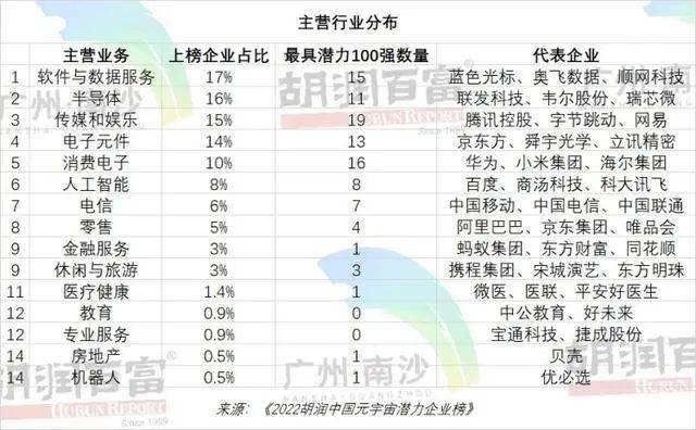 6月15日,胡润研究院发布《2022胡润中国元宇宙潜力企业榜》,列出了元宇宙领域最具发展潜力的中国企业200强,上市公司占比90%,以腾讯和阿里为代表;10%为非上市企业。
