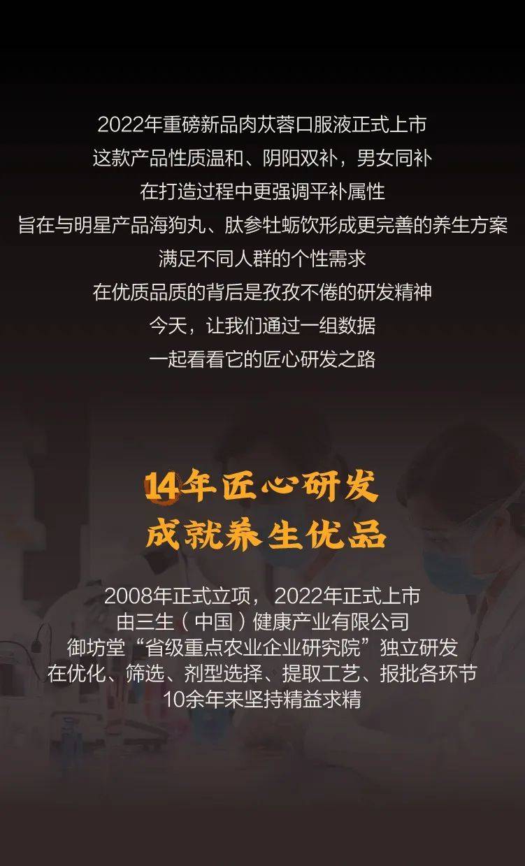 一年一度的三生(中国)健康产业有限公司2022元宇宙嘉年华召开,受到各界的瞩目。在这场三生嘉年华活动中,三生(中国)健康产业有限公司发布了三生公司的数字化战略规划,以及三生公司多年来潜心研究的新品,三生集团花了14年研发时间的“御坊堂牌肉苁蓉淫羊藿山茱萸口服液”(简称御苁蓉口服液)位列其中,备受关注。