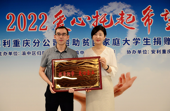 在活动现场,10名大学生获得了安利的爱心助学金,辖区政府授予安利“捐资助学 爱心企业”称号。