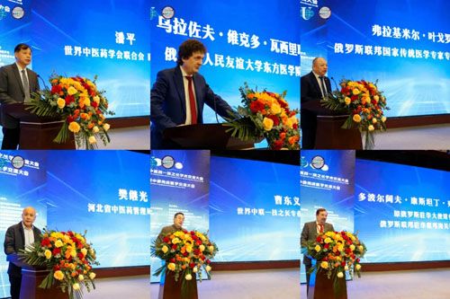 世界中医药学会联合会副秘书长潘平,俄罗斯人民友谊大学东方医学院院长乌拉佐夫.维克多.瓦西里耶维奇,俄罗斯联邦国家传统医学专家专业协会主席助理吴继华博士,河北省中医药管理局副局长樊继光,世界中医药学会联合会一技之长专业委员会会长曹东义,原俄罗斯驻华大使馆参赞、俄罗斯联邦驻华联邦海关署总代表多波尔阔夫.康斯坦丁.列奥尼多维奇等中俄两国中医药领域政府领导、国医大师、权威专家学者以及优秀企业代表齐聚一堂,共同探讨中医药与俄罗斯传统医学在理论、实践、产品方面的创新成果。