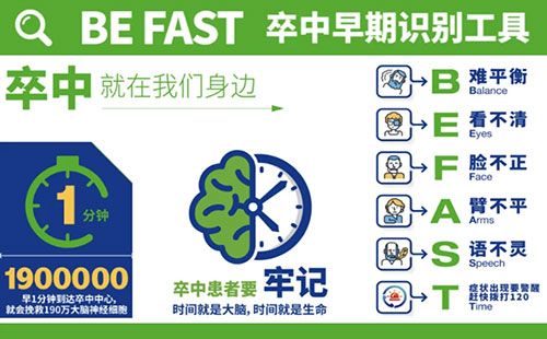 2021年7月,中国卒中学会在第七次学术年会期间正式发布了识别卒中早期症状的“BE FAST口诀”,前5个字母各代表一个早期症状,最后1个字母是提醒一旦发现卒中症状,就要马上拨打急救电话,立刻就医: