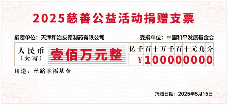 在“正青春 向未来——和治友德集团18周年庆典暨启航中国9周年庆典大会”大会上,天津和治友德制药有限公司再次向中国和平发展基金会“丝路幸福”专项基金爱心捐赠100万元人民币,专项用于在“一带一路”沿线国家开展与妇女、儿童相关的国际慈善公益项目和文化交流活动。中国和平发展基金会秘书长徐建国、亚非妇女发展与权益保障促进会会长赵美玲受邀出席捐赠仪式。