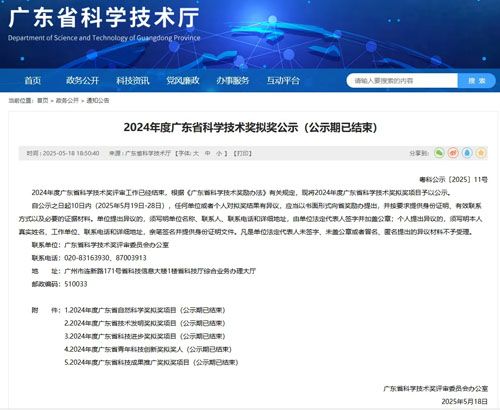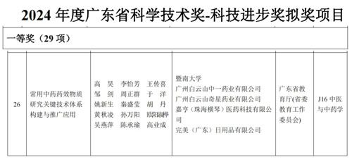近日,广东省科技厅公示了2024年度广东省科学技术奖获奖名单。其中,由暨南大学主导、完美(广东)日用品有限公司参与的项目《常用中药药效物质研究关键技术体系构建与推广应用》荣获“2024年度广东省科学技术奖科技进步奖一等奖”。