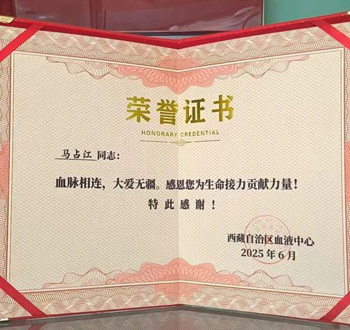 此次慰问对马占江多年来持续积极献血表示衷心感谢。尤其在今年初西藏定日县突发地震,血库供应告急时,马占江自告奋勇,用自己的热血,为他人搭建起生命的桥梁。
