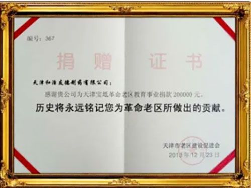 2013年和治友德捐款200000元,在宝坻区革命老区建立了“和治友德希望小学”,改善当地办学条件。