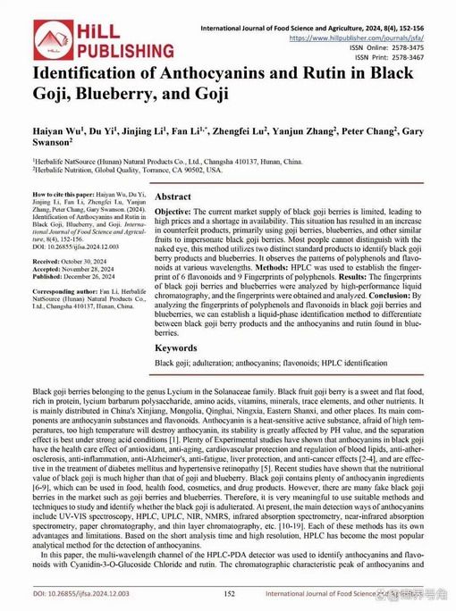 由于黑枸杞市场供应有限,导致价格居高不下且货源紧缺。这一现状催生了大量假冒产品,主要利用普通枸杞、蓝莓等近似果实冒充黑枸杞,肉眼难以鉴别。康宝莱中国科学家团队针对黑枸杞和蓝莓两种样品,采用高效液相色谱法(HPLC)建立6种黄酮类成分与9种多酚类成分的特征指纹图谱,基于黑枸杞与蓝莓中多酚类及黄酮类成分的指纹图谱差异,从而有效区分黑枸杞与蓝莓产品。此项研究成果的论文已在国际知名期刊《International Journal of Food Science and Agriculture》(国际食品科学与农业杂志)上发表。