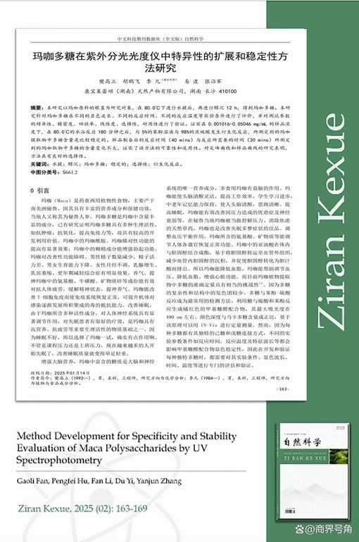玛咖(Maca)是一种原产于秘鲁的“药食两用”植物,被当地人称之为“秘鲁人参”。它营养丰富,含有多糖、玛咖酰胺等活性成分,具有多种保健功效。玛咖多糖, 作为其核心成分之一,结构复杂,传统检测方法受多个因素影响,其准确定量具有相当的挑战性。康宝莱中国科学家团队在采用经典的“苯酚-硫酸法”测量多糖含量的基础上对其进行优化,针对反应温度、时间、显色波长等不同条件进行了专门的评估和验证,最终成功探索出理想条件,从而实现了准确、稳定地测量出玛咖里的多糖含量,为后续研究玛咖的保健价值提供了可靠的技术支持。此项研究成果的论文已在知名期刊《自然科学》杂志上发表。