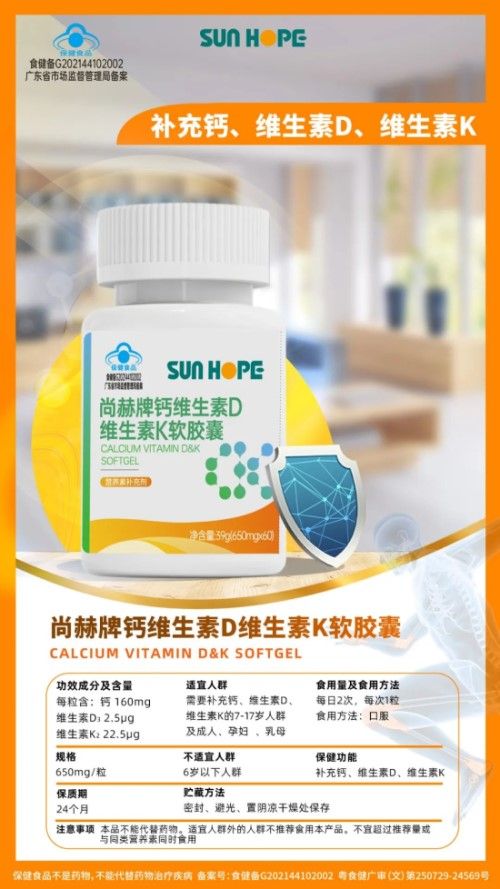 市场需求:1.4亿人的刚需骨骼养护我们不能局限于传统的补钙产品:01单一补钙局限市售82%的骨关节产品含钙,但现代人补钙更需协同营养素(如维生素D3、K2等促进钙吸收),和更加全面的补充方案。尚赫牌钙维生素D维生素K软胶囊保健功能:补充钙、维生素D、维生素K尚赫牌钙维生素D维生素K软胶囊,三效协同科学补钙!每粒含钙160mg+VD3 2.5μg+VK2 22.5μg,助力钙吸收与骨骼驻留。每日2次,每次1粒,精准补充全家健康基础营养。