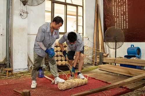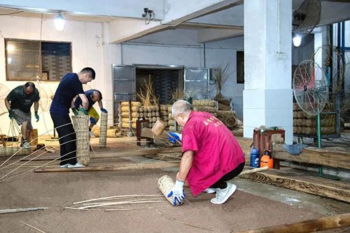 冷市黑茶产业园的制茶车间内,节奏紧凑而富有韵律。师傅们目光如炬,双手灵巧地缠绕着竹篾,一个个饱满紧实的千两茶坯在他们的脚下悄然诞生。他们娴熟的动作,是岁月雕琢的技艺,是匠人精神的完美体现。