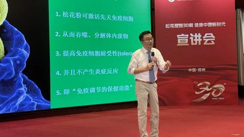 赵捷教授带来《免疫、生态与大健康》主题讲座,通过中西方医药发展历史鲜明对比介绍,弘扬了中医药传统文化,增强了民族自信和自豪感。随后对松花粉持续深入研究成果进行通报,指导大家通过均衡营养来提升免疫力,守护家人和自身健康。