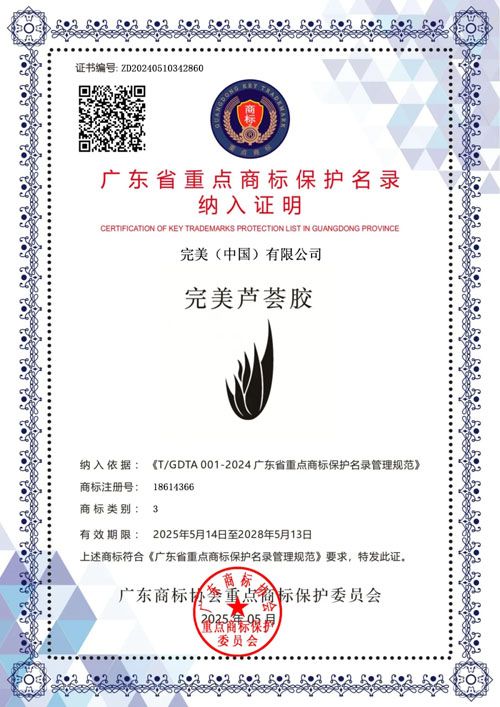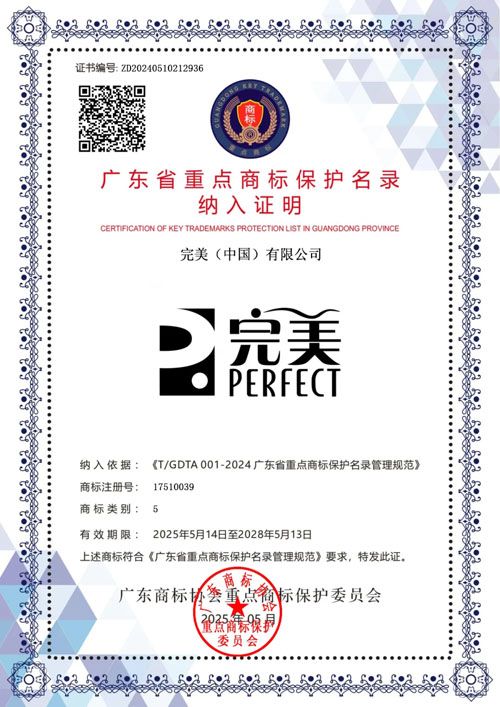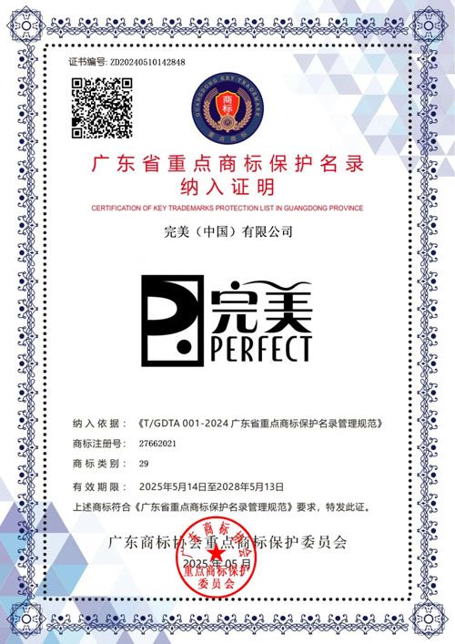 截至目前,完美公司已有10件商标荣登广东省重点商标保护名录榜单,保护范围覆盖健康食品、化妆品、保洁用品及个人护理产品等核心主营业务领域。每一件入选商标均承载着完美公司在知识产权强企建设方面的不懈追求,彰显了商标品牌建设在细分市场的行业领先优势。