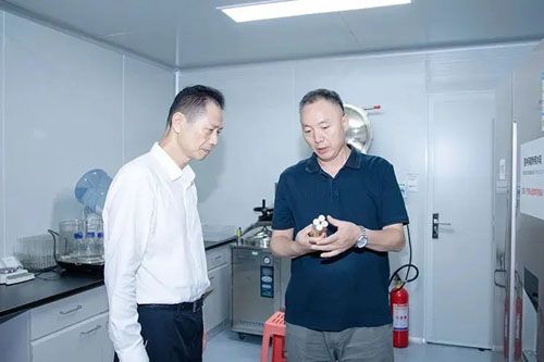 在理想华莱研发中心,研发中心主任贺军辉博士向调研团介绍了黑茶深加工技术应用、新产品研发方向以及技术创新成果转化等情况。林钟乐会长对此给予高度肯定。