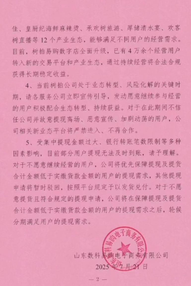 就在维权现场传出了几张有关此事的相关通告。一则是落款为山东数科易购电子商务有限公司于7月21日当天贴出的公告《致树拍服务公司及各经营用户的一封信》: