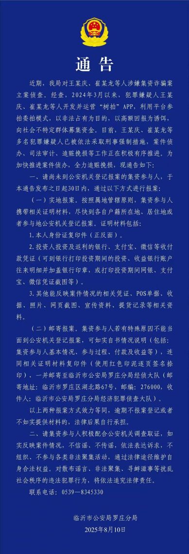 8月10日,山东省临沂市公安局罗庄分局发布通告称,自2024年3月以来,犯罪嫌疑人王某庆、崔某龙开发并运营“树拍”App,利用平台参拍委拍模式,以非法占有为目的,以高额回报为诱饵,向社会不特定群体募集资金。目前,王某庆、崔某龙等多名犯罪嫌疑人已被依法采取刑事强制措施,案件侦办、司法审计、追赃挽损等工作正在积极有序推进。