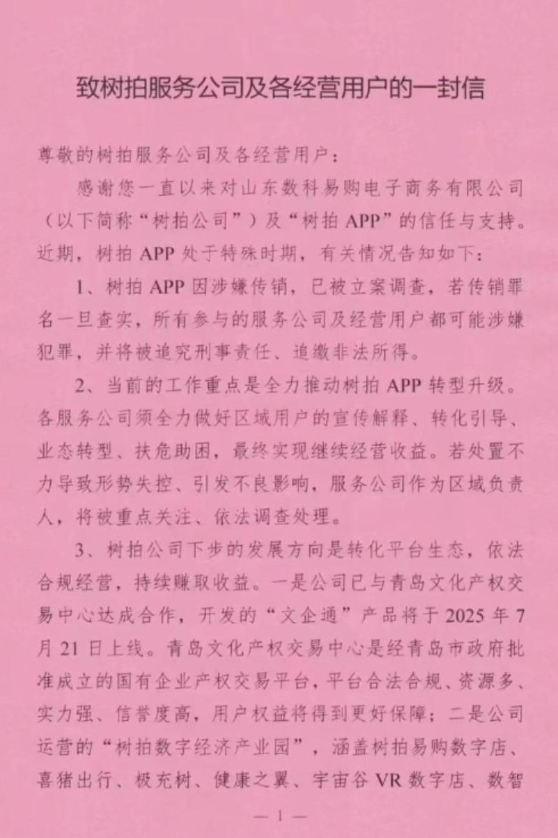 1、明确树拍App因涉嫌传销已被立案调查。并强调,若传销罪名一旦查实,所有参与的服务公司及经营用户都可能涉嫌犯罪,并将被追究刑事责任、追缴非法所得。