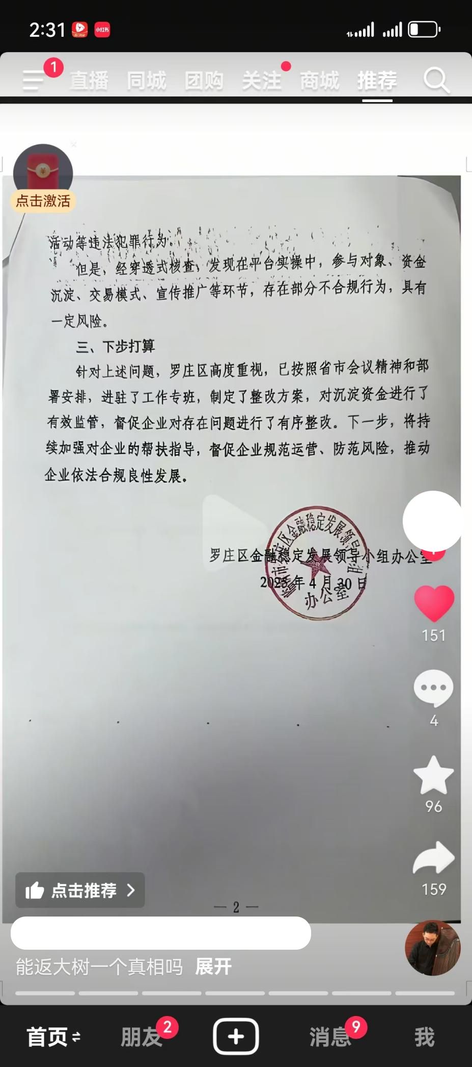 早在4月,就有落款为罗庄区金融稳定发展领导小组办公室的情况说明流传于网络,称相关部门第一时间成立由金融、商务、市场监管、公安、第三方审计机构组成的工作组,针对树拍集团及关联公司存在的有关问题全面开战摸底调查,详见下图:
